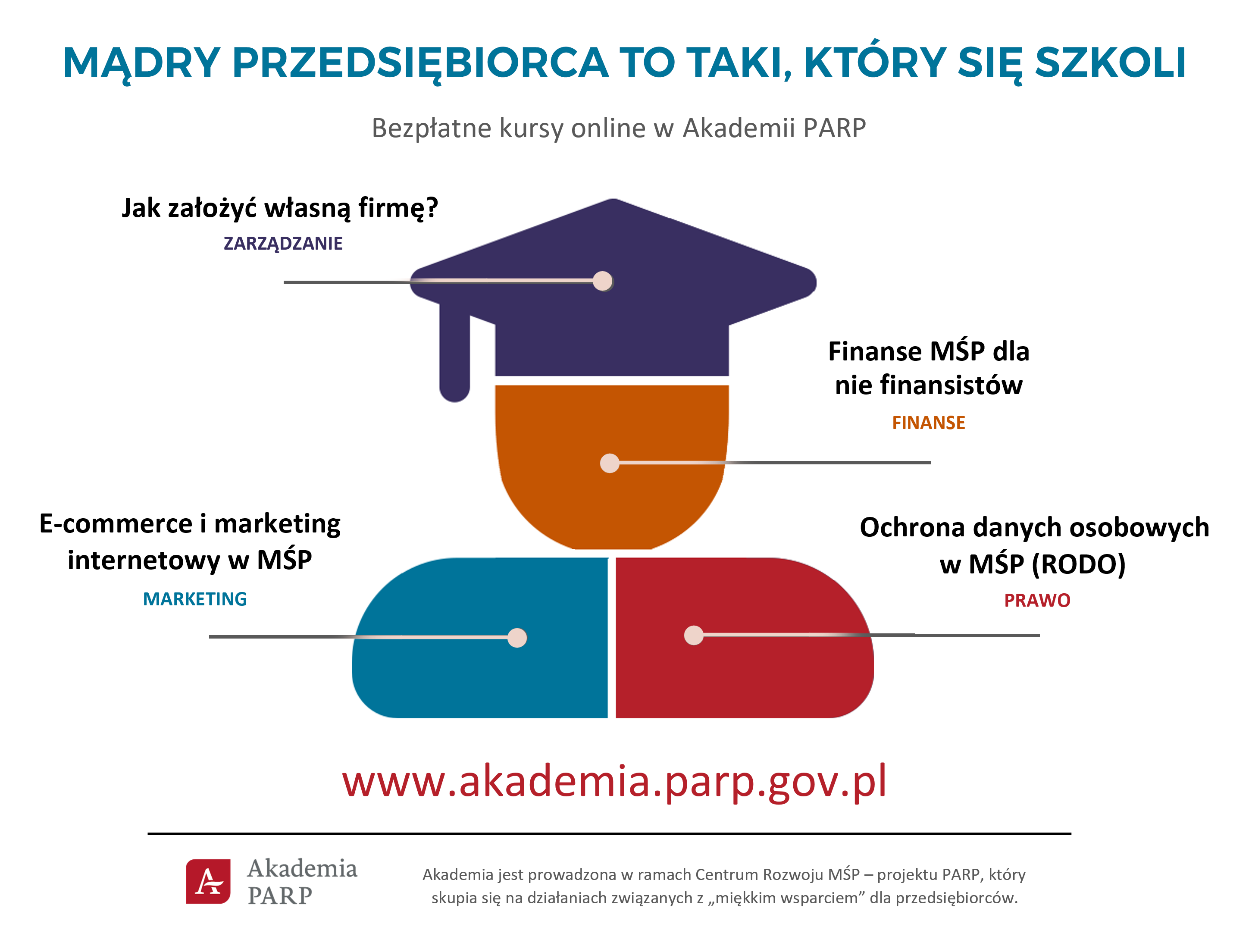 „Akademia PARP” to interaktywna platforma z bezpłatnymi szkoleniami skierowanymi dla przedsiębiorców i osób, które dopiero planują założyć działalność gospodarczą. Aktualnie dostępnych jest 16 kursów z czterech obszarów.