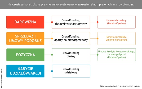 Szczegółowej analizy implikacji prawnych i podatkowych, z którymi w każdym z modeli crowdfundingu muszą liczyć się finansujący, beneficjenci i operatorzy platform, podjęła się kancelaria Wardyński i Wspólnicy. W raporcie „Crowdfunding”, sporządzonym we wrześniu 2014 r., wymieniane są następujące rodzaje finansowania społecznościowego: