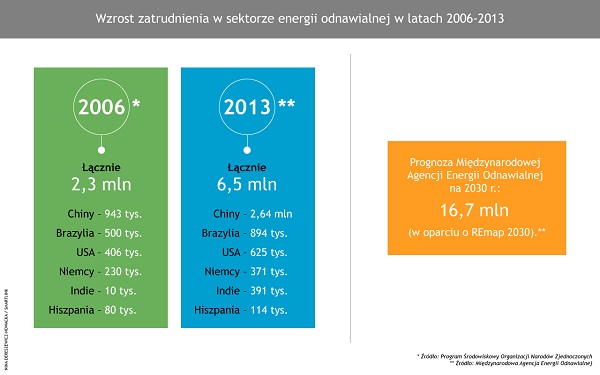Jedną z nich są tzw. zielone miejsca pracy, czyli zawody związane z sektorem energii odnawialnych. Według twórców raportu „Renewable Energy and Jobs – Annual Review 2014”, w samym tylko 2013 r. w globalnym sektorze OZE powstało 800 tys. nowych miejsc pracy, a łączna liczba zatrudnionych osób sięgnęła 6,5 mln (zob. infografika).