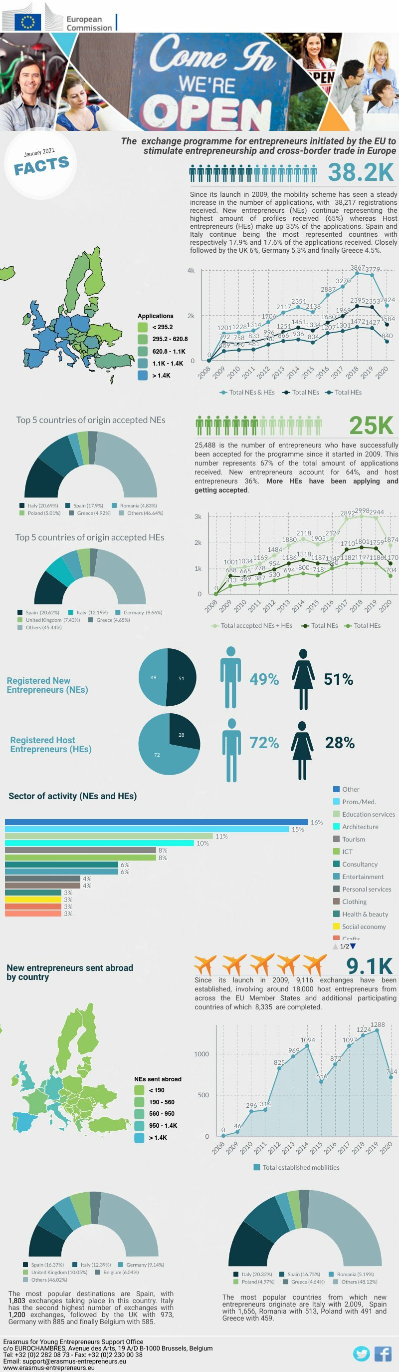 Młodzi przedsiębiorcy najchętniej zdobywają doświadczenie u swoich doświadczonych kolegów i koleżanek z Hiszpanii (1803 wyjazdy), Włoch (1200), Zjednoczonego Królestwa (973), Niemiec (885) oraz Belgii (585).