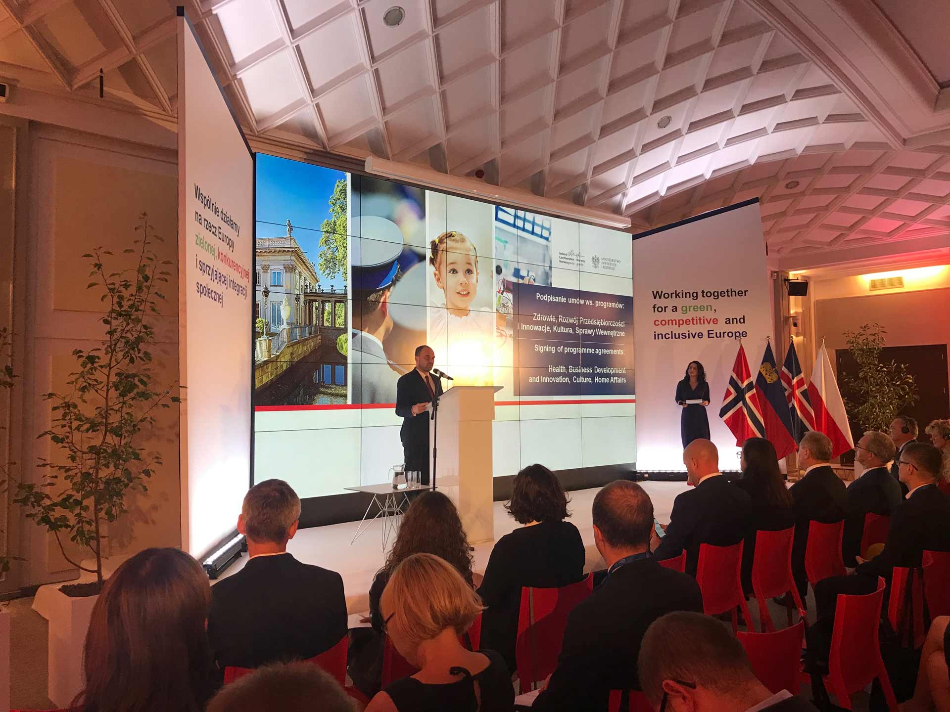 W ramach nowej edycji Funduszy norweskich i EOG zostały już uruchomione trzy pierwsze programy: „Edukacja”, „Badania” i „Rozwój Lokalny”. Dzięki dzisiejszemu podpisaniu umów w sprawie realizacji czterech kolejnych programów: „Kultura”, „Sprawy Wewnętrzne”, „Zdrowie”, „Rozwój Przedsiębiorczości i Innowacje”, zdecydowana większość Funduszy edycji 2014-2021 staje się dostępna do wykorzystania. To szansa między innymi na realizację cennych inicjatyw promujących przedsiębiorczość w obszarze kultury, jeszcze skuteczniejsze zwalczanie przestępczości, wzmocnioną profilaktykę i ograniczanie nierówności społecznych w zdrowiu oraz wspieranie innowacyjności i konkurencyjności polskich przedsiębiorstw.
