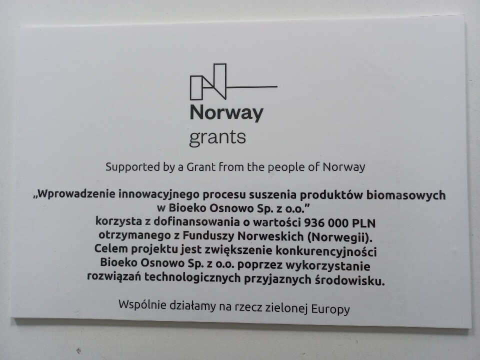 BioEko Osnowo jest certyfikowanym producentem pelletu Agro oraz pelletu drzewnego produkowanego z wyselekcjonowanej trociny sosnowej bez żadnych dodatków. Poprzez realizację projektu chcieliśmy połączyć interesy świadomych ekologicznie użytkowników energii z interesami nowoczesnych producentów substancji organicznej, podnosząc jednocześnie efektywność cenową pelletu i zyskowność produkcji. Wprowadziliśmy innowacyjny procesu suszenia produktów biomasowych. Polega on na połączeniu produkcji energii cieplnej, której nośnikiem będzie woda o temperaturze 90°C podgrzewana w kotle na świeżą (mokrą) biomasę, z procesem suszenia wysokogatunkowej biomasy roślinnej z wykorzystaniem suszarki taśmowej do biomasy.