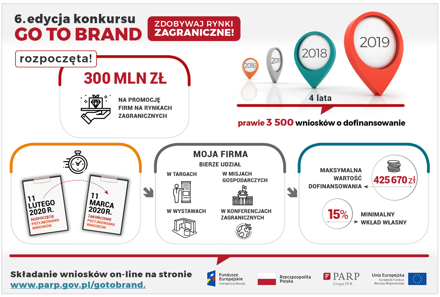 Polska Agencja Rozwoju Przedsiębiorczości ogłasza 6. edycję konkursu „Go to Brand”, którego celem jest sfinansowanie promocji marek produktowych na rynkach zagranicznych. Program adresowany jest do przedsiębiorców z sektora MMŚP prowadzących działalność gospodarczą na terytorium RP z wyłączeniem województwa mazowieckiego. Firma musi prowadzić działalność w branżach o wysokim potencjale konkurencyjnym i innowacyjnym. Wnioski będzie można składać od 11 lutego 2020 r. do 11 maca 2020 r.