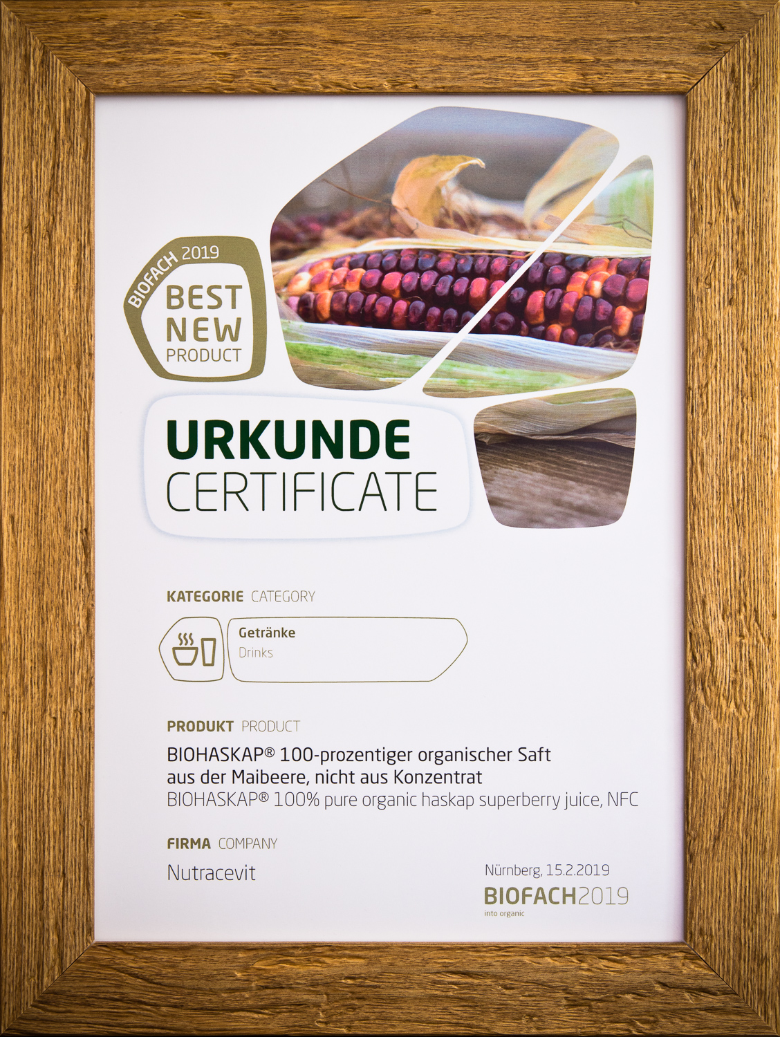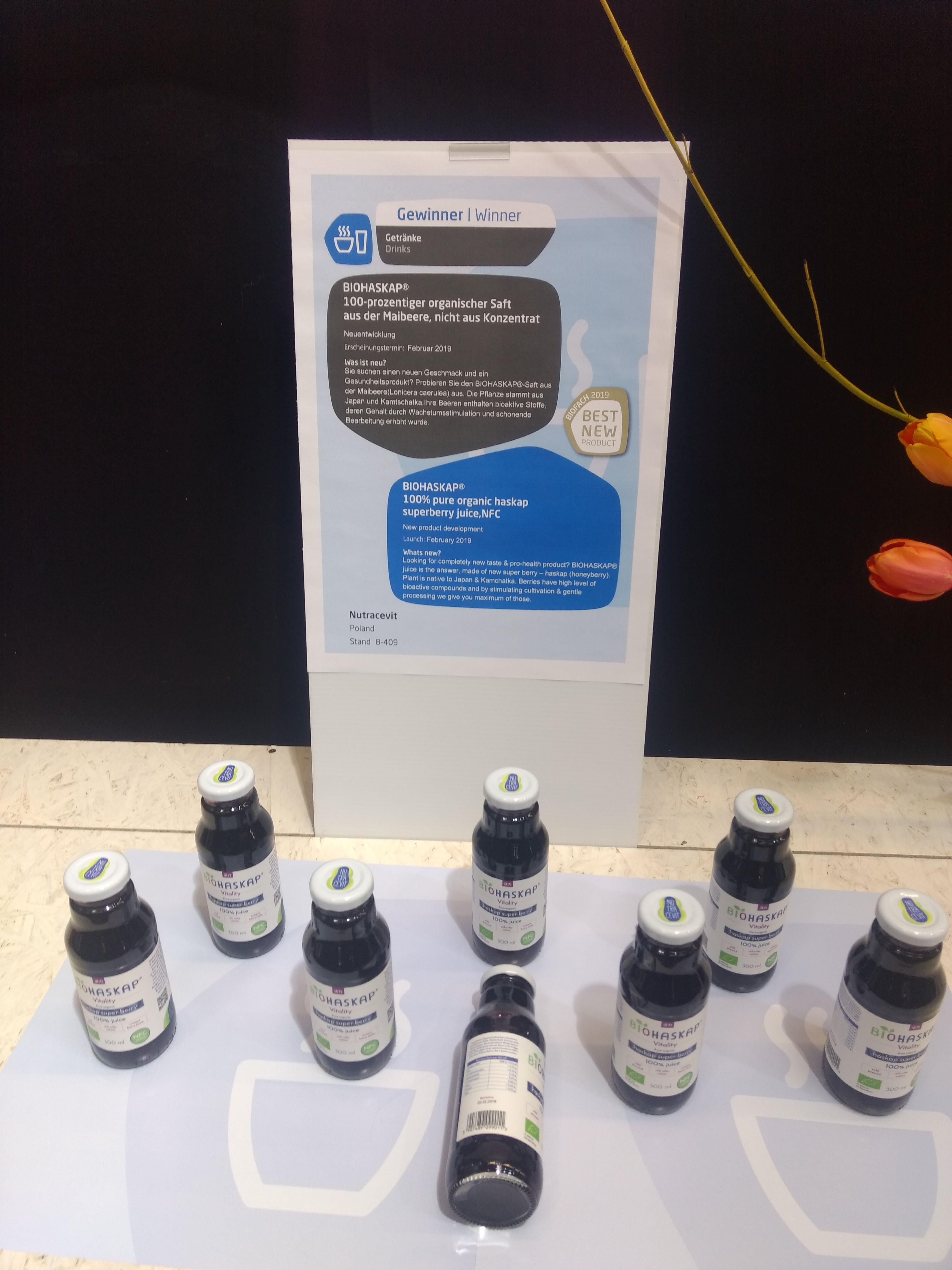 Tłoczony na zimno sok z ekologicznej jagody kamczackiej BIOHASKAP Vitality, zdobył BEST NEW PRODUCT AWARD 2019 w kategorii napoje na największych targach ekologicznej żywności BIOFACH, które odbyły się w dniach 13-16.02 w Norymberdze. Producentem soku jest Nutracevit, rodzinna firma z Łodzi, której właściciele Małgorzata i Marcin Jaszyk zarówno uprawiają, jak i przetwarzają jagodę kamczacką. Plantacja jagody mieści się na Kujawach w centralnej Polsce, z dala od ośrodków przemysłowych i autostrad. Sam zaś gatunek tej jagody pochodzi z Japonii i Kamczatki, gdzie przez ludy Ainu nazywana jest „eliksirem życia”, ze względu na zawartość wielu cennych związków, w tym polifenoli i antocyjanów oraz rzadko obecnych w owocach irydoidów, które mają lecznicze i przeciwzapalne właściwości.