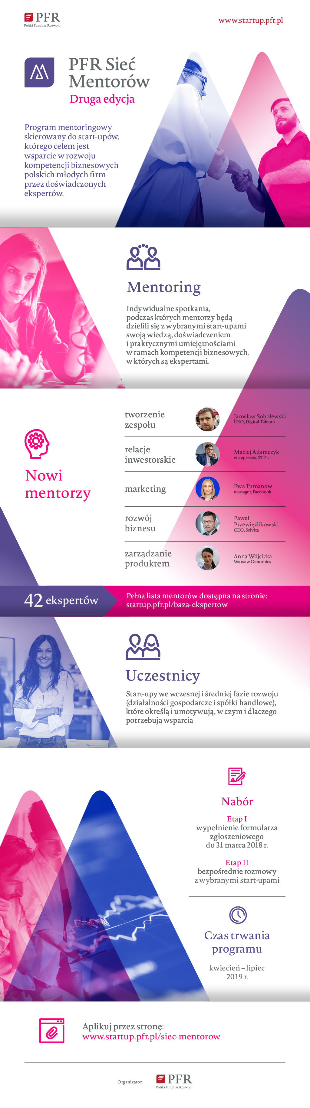 Polski Fundusz Rozwoju po raz drugi organizuje program mentoringowy Sieć Mentorów PFR. Do poprzedniej edycji aplikowało ponad 120 start-upów, spośród których 30 zespołów skorzystało z praktycznej wiedzy mentorów. Kolejna edycja to także 15 nowych ekspertów m.in. ze spółek, takich jak Selvita, Zortax, XTPL czy deepsense.ai.