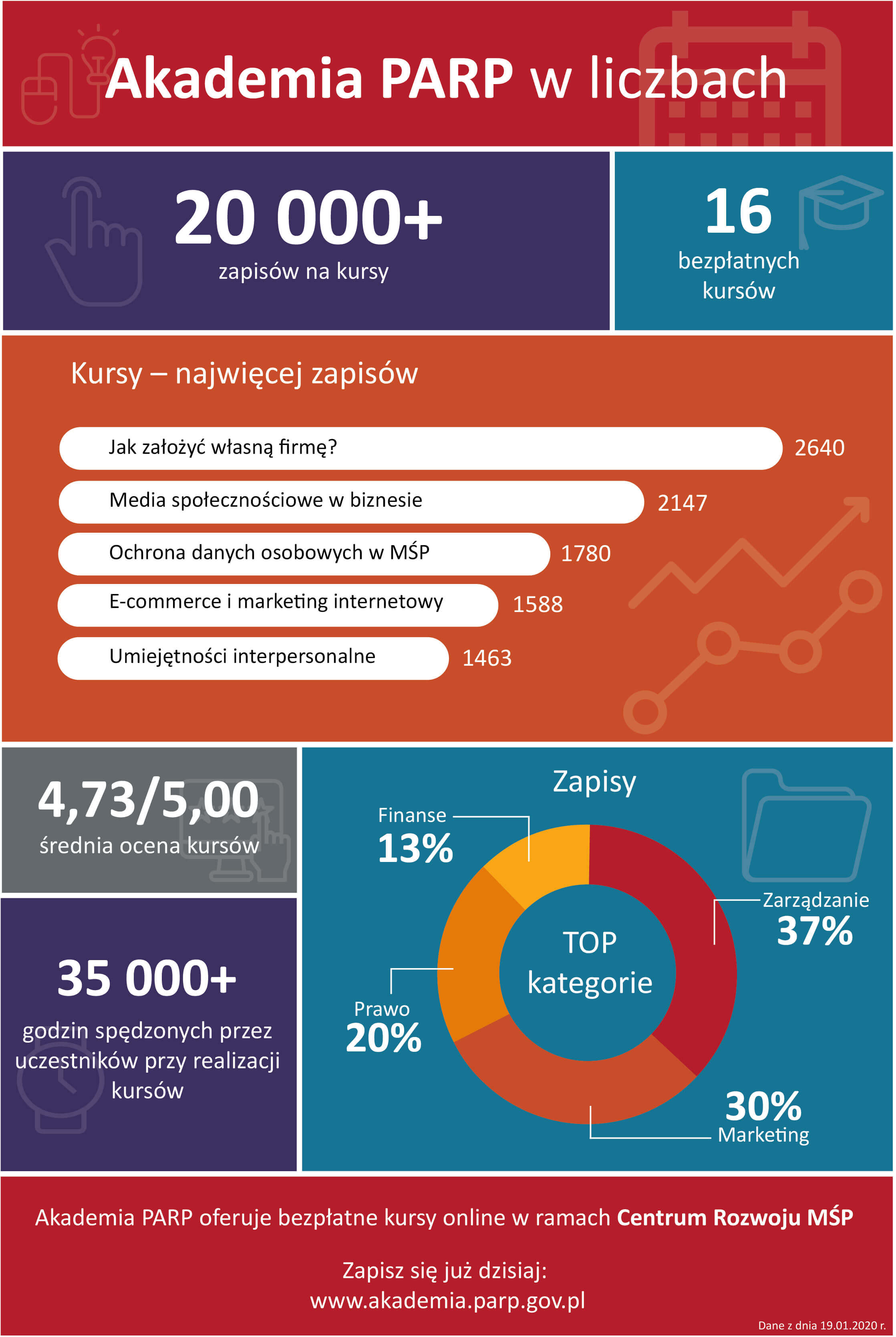 Od 27 czerwca 2019 r. kiedy portal e-learningowy Polskiej Agencji Rozwoju Przedsiębiorczości został uruchomiony w nowej odsłonie, licznik zapisów na kursy on-line przekroczył 20 tysięcy. Obecnie w akademii interaktywnej platformie z bezpłatnymi szkoleniami – dostępnych jest 16 kursów z zakresu finansów, zarządzania, marketingu i prawa.