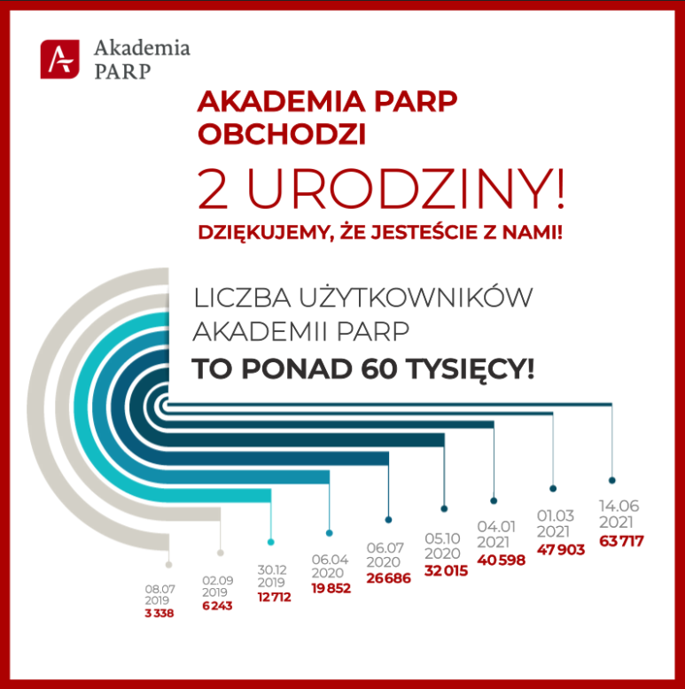 „Drodzy użytkownicy, 27 czerwca 2021 r. projekt Akademia PARP obchodzi swoje 2 urodziny. Z tej okazji pragniemy serdecznie podziękować Wam oraz wszystkim pozostałym osobom, które aktywnie uczestniczyły w życiu naszej platformy za wsparcie i pomoc w rozwoju serwisu.
