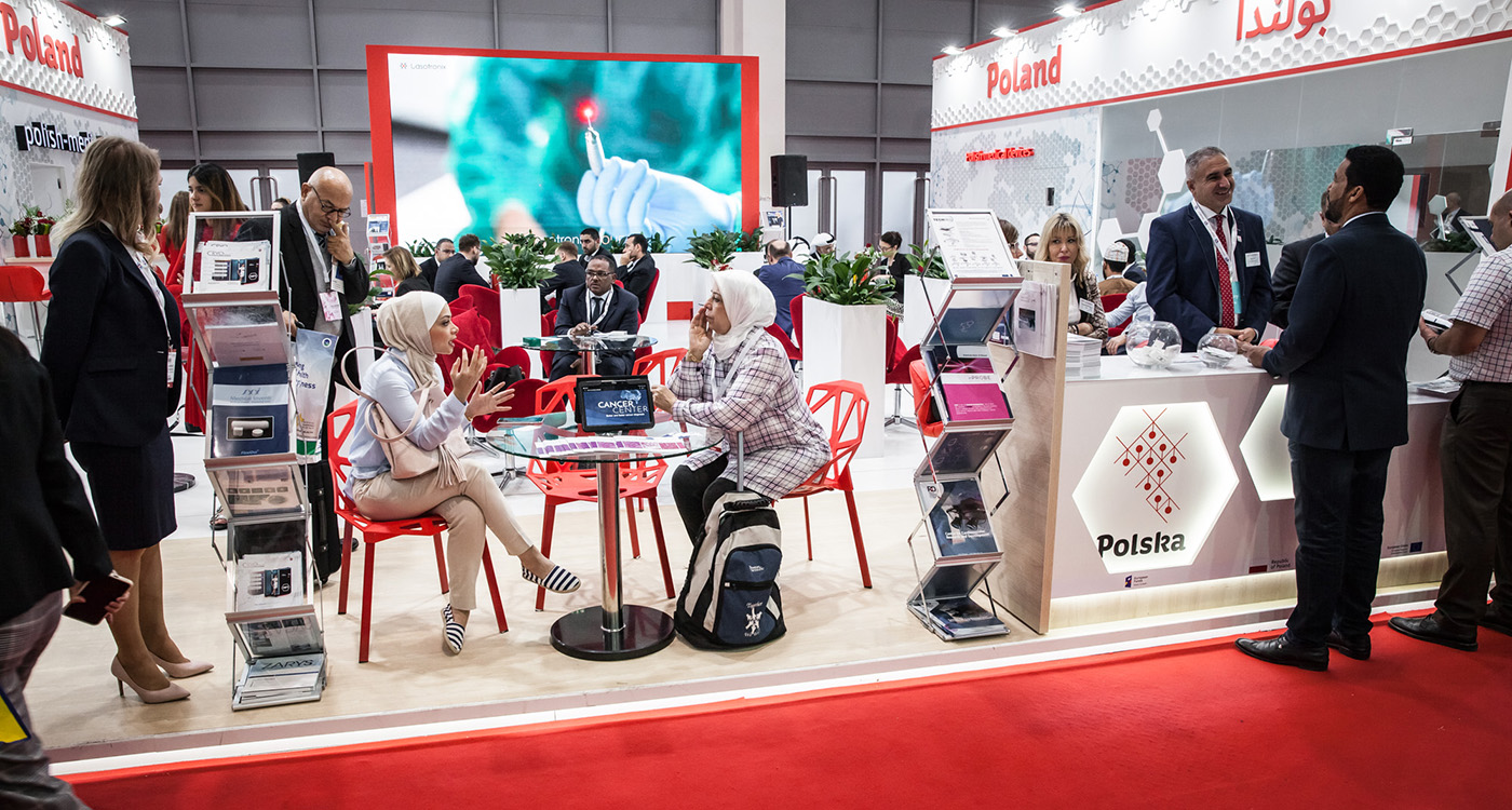 W 2018 r. na zalecenie Ministerstwa Przedsiębiorczości i Technologii (obecnie Ministerstwo Rozwoju i Technologii), w ramach programu Dużych Przedsięwzięć Promocyjnych, zorganizowaliśmy stoisko narodowe o powierzchni 240 m2 na targach Medica, na którym swoje materiały promocyjne zaprezentowało ponad 140 firm z kraju. Większość z nich skorzystała też z przestrzeni udostępnionej do spotkań B2B w ramach stoiska.