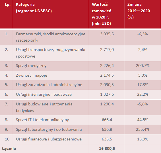 Lista 10 kategorii generujących najwyższe wolumeny zamówień pozostała zasadniczo nie zmieniona, z wyjątkiem kategorii sprzętu IT i telekomunikacyjnego, która powróciła do zestawienia z miejsca jedenastego w roku 2019 oraz sprzętu laboratoryjnego i do testowania, która awansowała na miejsce dziewiąte z pozycji dwudziestej. Dwie kategorie, które w 2020 r. wypadły z listy to paliwa i smary (spadek na miejsce jedenaste) oraz podróże, wyżywienie i zakwaterowanie (spadek na miejsce dwudzieste). Osiem kategorii odnotowało wzrost, a dwie spadek wartości zamówień w stosunku do roku 2019. Liderem pozostaje kategoria farmaceutyków, środków antykoncepcyjnych i szczepionek, z wartością zamówień wynoszącą 3 mld USD, którą dotknął jednakże spadek w stosunku do roku ubiegłego – o 204 mln USD (6,3%). Druga w kolejności kategoria – usługi transportowe, magazynowania i pocztowe, odnotowała niewielki 2,4 procentowy wzrost, głównie dzięki zwiększeniu wartości zamówień w grupie usług związanych z transportem towarów, przy jednoczesnym istotnym spadku (o 309 mln USD) wydatków na lotniczy transport pasażerski. Największy spadek wartości zamówień w stosunku do 2019 r., aż o 360 mln USD (63%), nastąpił w segmencie podróży, wyżywienia i zakwaterowania.