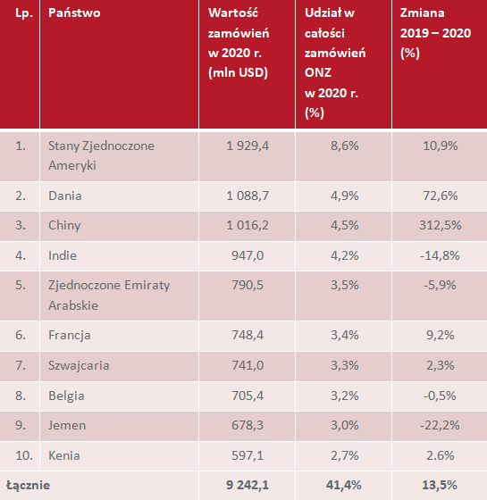 Polska zajęła w rankingu państw-dostawców ONZ odległe 162. miejsce, z kwotą zamówień wynoszącą 4,97 mln USD (poniżej 0,1% całości zamówień ONZ), przy czym należy zauważyć pozytywny trend - wzrost wartości zamówień w stosunku do 2019 r. o 1,01 mln USD, czyli aż o 25,5%. W przypadku Polski, dominują zamówienia w sektorze usługowym: na pierwszym miejscu pod względem wartości znalazły się zamówienia na usługi zarządzania i administracyjne (1,9 mln USD), na drugim zamówienia na usługi inżynieryjne i badawcze (1,2 mln USD), a na trzecim usługi finansowe i ubezpieczeniowe (353,5 tys. USD). Kategoria sprzętu medycznego zajmuje dopiero pozycję czwartą (222,3 tys. USD), a farmaceutyki, środki antykoncepcyjne i szczepionki, szóstą (207,5 tys. USD).